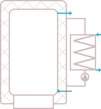Применение выносного теплообменника и насосной схемы циркуляции воды позволяет значительно ускорить процесс нагрева воды в водонагревателе, делает всю систему более ремонтопригодной, по сравнению со встроенным теплообменником.