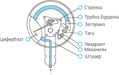 Механизм манометра помещен в корпус. Измеряемое давление поступает внутрь трубки, которая под действием этого давления стремится распрямиться, так как площадь наружной поверхности больше площади поверхности внутренней. Перемещение свободного конца трубки через передаточный механизм передается стрелке, которая поворачивается на определенный угол. Между измеряемым давлением и деформацией трубки существует прямолинейная зависимость и стрелка, отклоняясь относительно шкалы манометра, показывает величину давления.