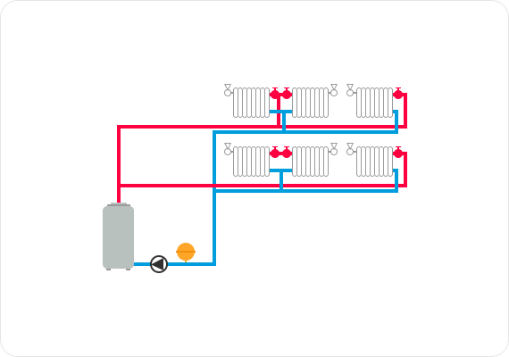 На главном стояке каждого этажа располагаются коллекторы, подающий и обратный. От коллекторов подающие и обратные трубопроводы подводятся под полом или в стене к каждому радиатору на этаже. Нужно стремиться к тому, чтобы каждое из колец было примерно одинаковой длины. Если это не так, то каждое из тепловых колец может быть снабжено собственным циркуляционным насосом и собственной автоматической регулировкой температуры теплоносителя, причем регулировка температуры на каком-либо тепловом кольце почти никак не отразится на других тепловых контурах. В связи с тем, что трубы отопления находятся в стяжке пола, необходимо на каждом радиаторе установить воздушные краны или автоматический воздухоотводчик размещают на коллекторе либо воздухоотводчики устанавливают и на радиаторах, и на коллекторе.