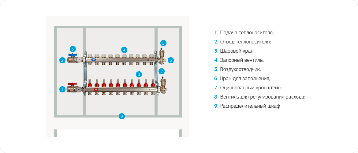 Гребенка для отопления функционирует просто. Носитель тепла, который разогрет котлом до необходимой температуры, идет в подающую гребенку. Далее он распределяется между приборами отопления. К каждому прибору ведет отдельный трубопровод, по которому и идет носитель тепла. В радиаторе жидкость, которая уже отдала часть тепла, частично охлаждается, по другой трубе идет в обратную гребенку и оттуда – в котел. Благодаря такому распределению радиаторы разогреваются равномерно, так как к каждому подходит отдельная подающая труба.