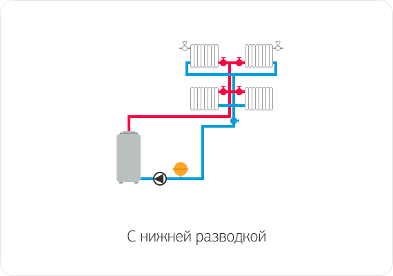 Двухтрубные системы отопления с нижней разводкой в сравнении с системами с верхней разводкой имеют следующие преимущества: сокращается количество трубопроводов, проходящих в неотапливаемых помещениях, следовательно, уменьшаются непроизводительные потери тепла; в процессе обслуживания системы отключение отдельных стояков на случай аварии более удобно, так как краны на подающем и обратном стояках расположены в одном месте.
