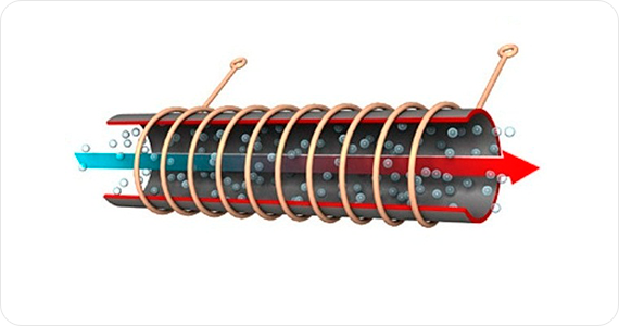 Принцип их работы основан на электромагнитной индукции. Вокруг трубы из диэлектрика намотана обмотка из изолированной проволоки. Протекающий по ней ток генерирует электромагнитное поле, которое, в свою очередь, вызывает нагрев любого ферромагнетика внутри трубы. Его катушка индуктивности расположена в отдельном герметичном отсеке. Это означает, что контакт с теплоносителем, циркулирующим в контуре аппарата, полностью исключен.