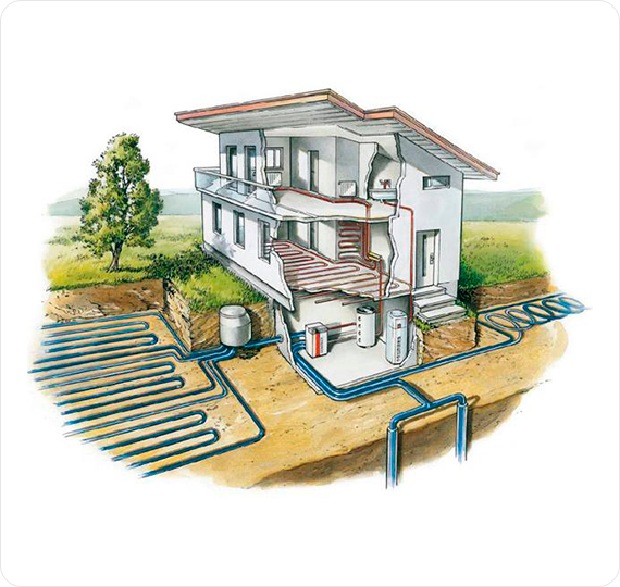 В доме устанавливают тепловой насос, который превращает энергию грунта, воздуха, воды в тепло, требуемого для подогрева воды системы отопления дома.