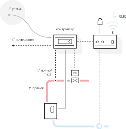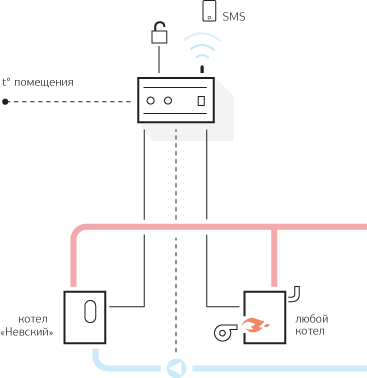 Совместная работа GSM-модуля с электрокотлом «Невский» дает возможность с помощью SMS-сообщений включать и выключать котел, дистанционно изменять температуру в помещении, запрашивать показания датчиков котла и охранной сигнализации. В случае, каких либо отклонений в работе котла или охранной системы GSM-модуль автоматически пошлет Вам SMS сообщение.